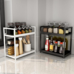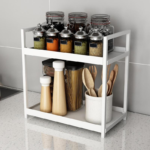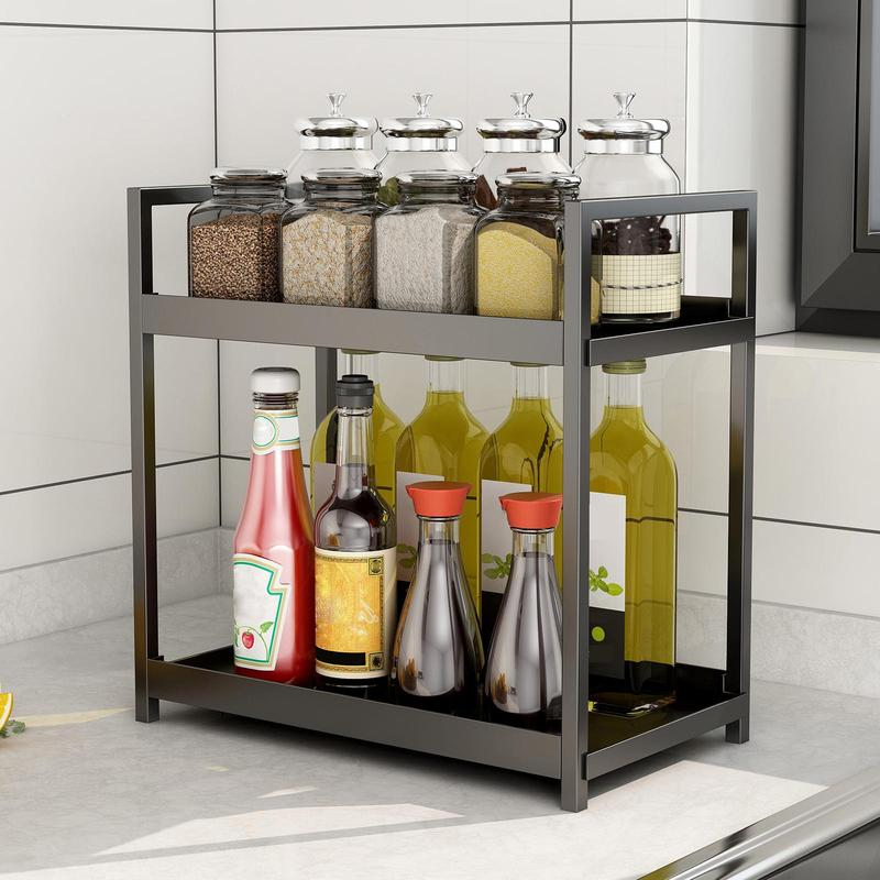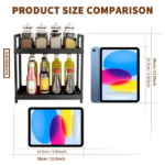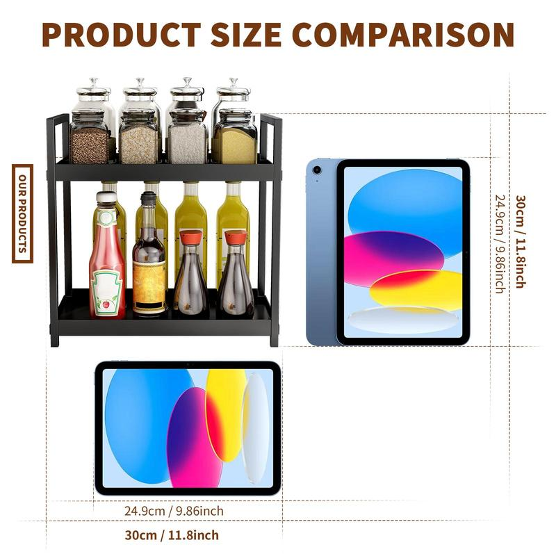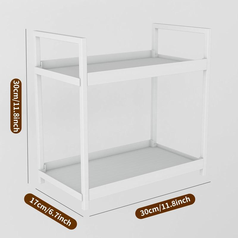 【Dual-layer Design】: Featuring a 2-tier architecture, this rack maximizes storage space, ideal for organizing cosmetics and spice jars efficiently.