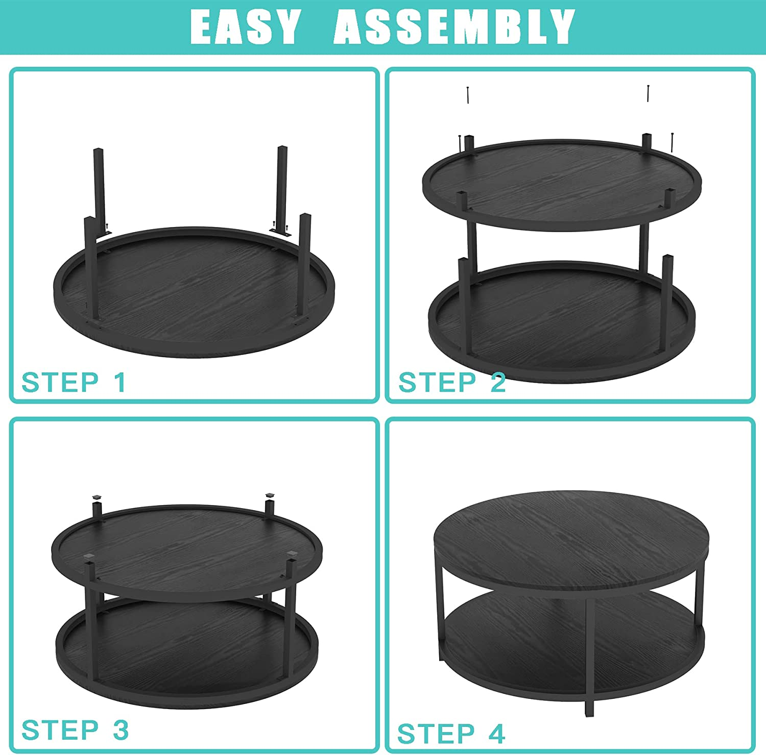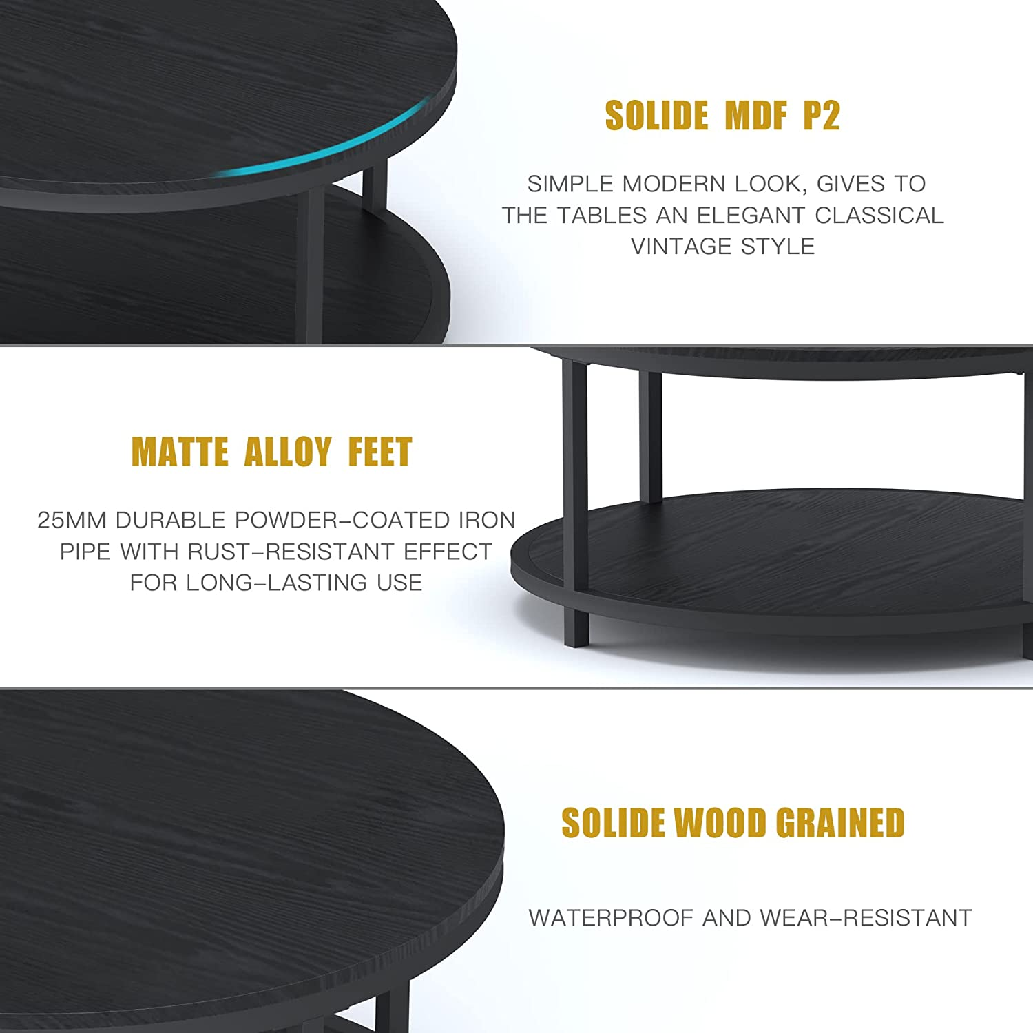 - [Sturdy Wood Coffee Table] The top of our round coffee table is made of MDF material which is Eco-friendly P2 particle board, waterproof and wear-resistant, Multi-step finish process achieves both good looks and superior durability. Thick matte alloy legs sturdy enough to support the coffee table.
