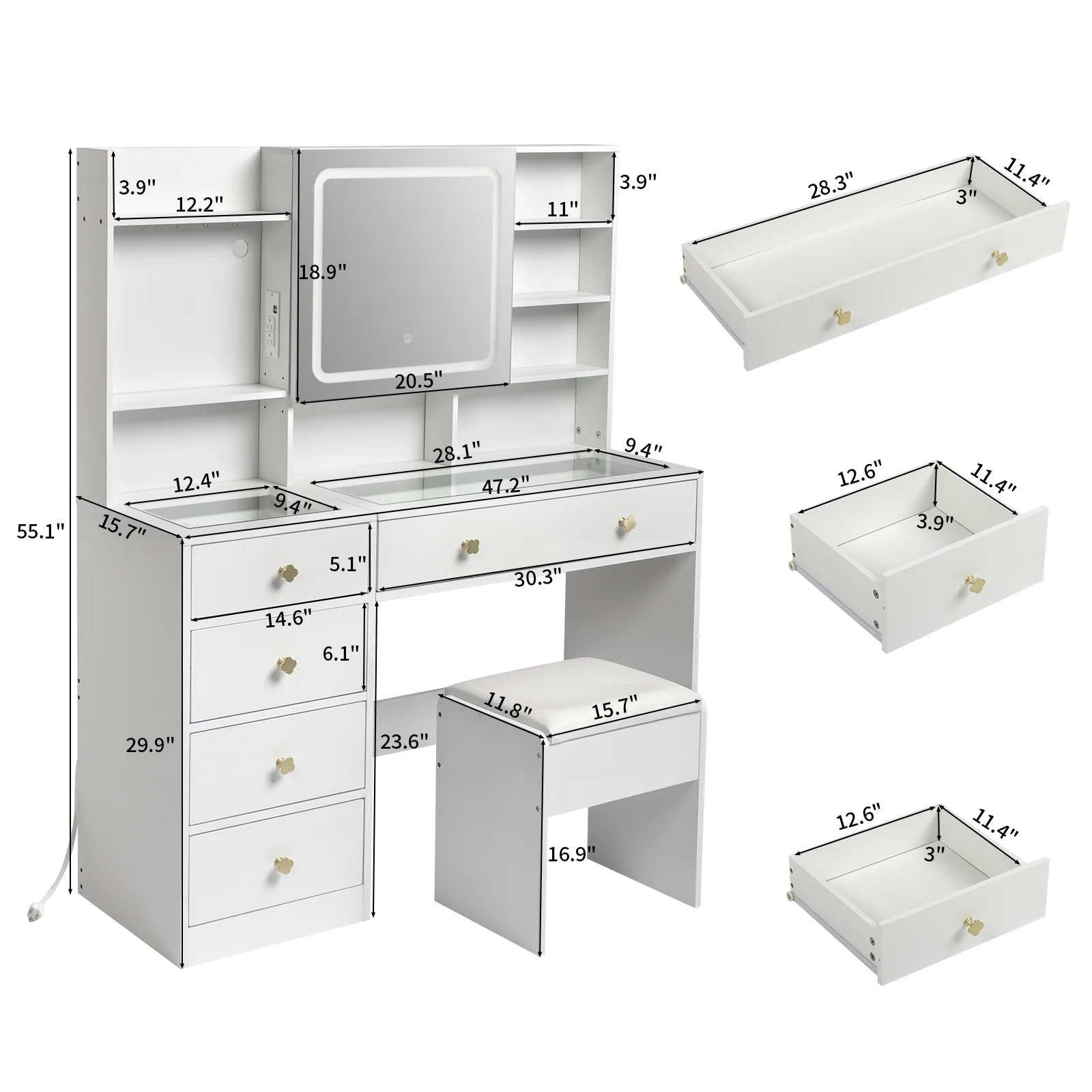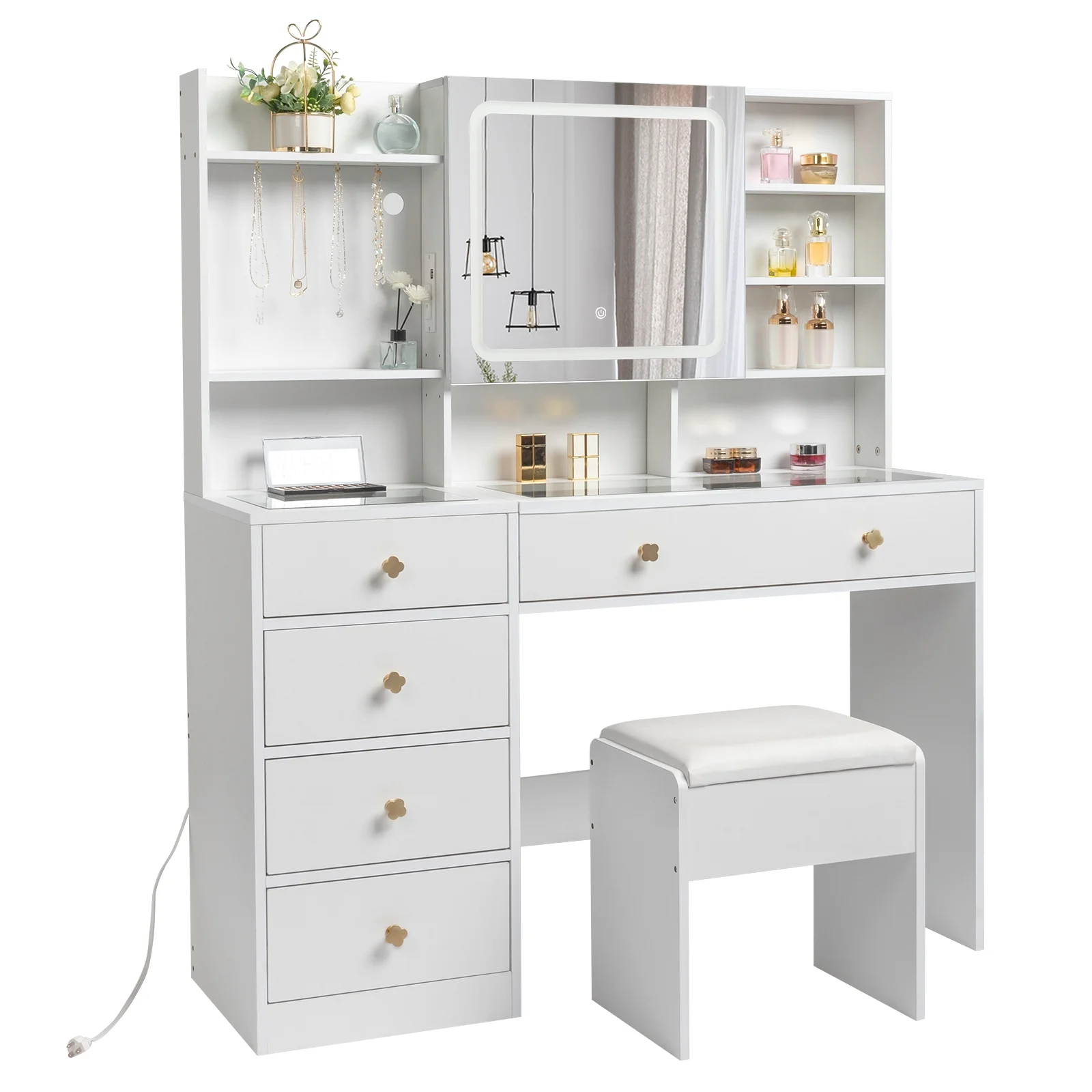 Large 47.2″ Makeup Vanity with 3 Color Lights, Vanity Desk with USB Charging Station, Vanity Makeup Table with Visible Drawers, Hidden and Open Storage Shelves, White