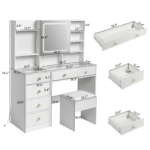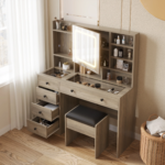 We understand the importance of staying connected in today’s digital world. That’s why our vanity desk comes with a built-in charging station. You can conveniently charge your phone, tablet, or other electronic devices while getting ready, eliminating the need for multiple power outlets or messy cables.