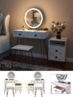 - LED Light Makeup Mirror: The makeup dresser comes with a round smart mirror with 3 colors and dimmable brightness, which will clearly and realistically reflect your appearance when makeup. Touch the button to light up the mirror, long press to adjust the brightness on each color lighting mode. The touch switch allows wet hands to operate properly and makes you safer to use. The mirror can be 360° rotated to any angle you like, allowing you to check your makeup and hairstyle from different angles