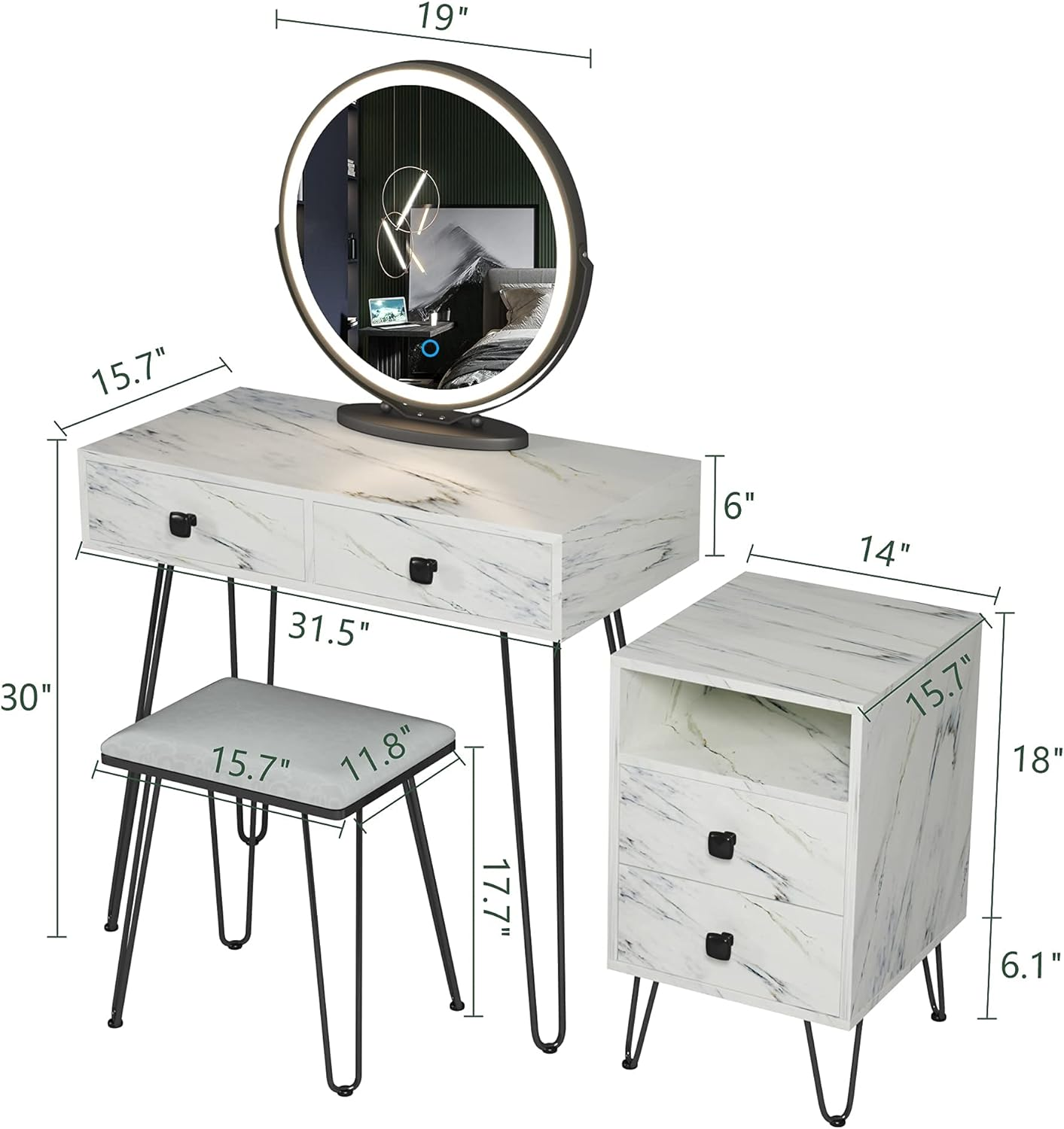 Specifications: Vanity size: 31.5 x 15.7 x 30 inch (length x width x height) Cabinet size: 14 x 15.7 x 24.1 inch (length x width x height) Stool size: 15.7 x 11.8 x 17.7 inch (length x width x height) Material: P2 density board, pine, iron leg, PU leather, sponge, built-in three-color LED strip, glass, acrylic Product net weight: 35.6kg Product gross weight: 38.5kg Packing size: 22.6”*16.7”*35.4” Package Includes: 1 X Dresser 1 X Cabinet 1 X Stool 1 X Mirror 1 X transparent storage organizer